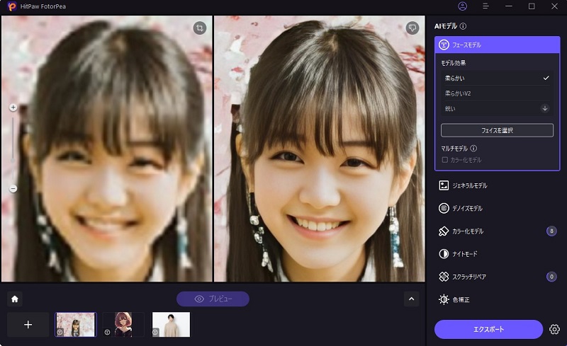また、フェイスモデルで顔写真のぼかしを除去したり、カラーモデルを使って白黒写真に色を追加することも可能です。システムはあなたに最適なモデルを自動的に判断することもできます。