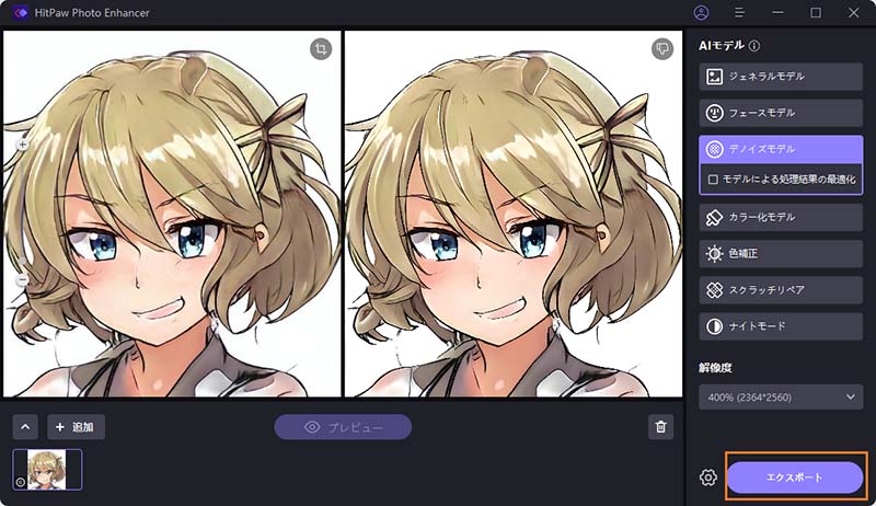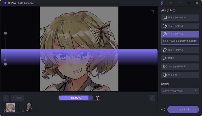 処理結果を確認して、「エクスポート」をクリックして処理された写真を保存します。