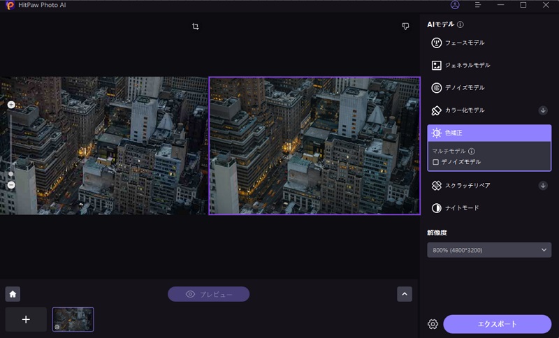 ステップ4:「プレビュー」ボタンを押すと、HitPawのAIが即座に写真の照明、色、ディテール、ノイズなどを調整します。明るくなった写真をプレビューします。必要であれば最後の微調整を行い、最終的に明るくなった画像をエクスポートして使用したり共有したりします。