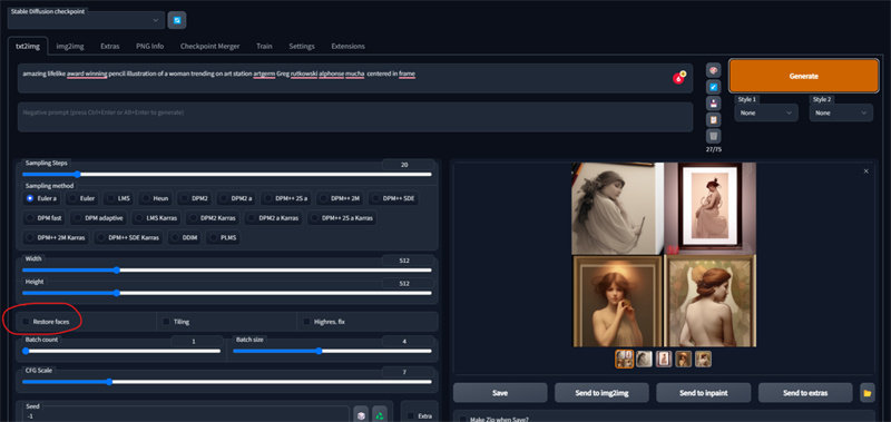 新しい画像を生成する前に、ツールのメニューを探索して、「Restore Faces」アイコンを選択しなければいけません。