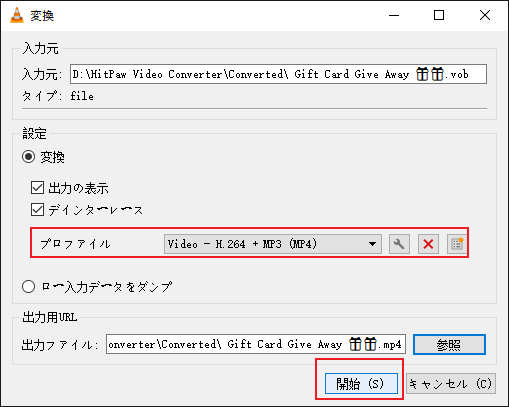 手順04変換されたファイルの名前を入力し、変換されたファイルの宛先パスを選択します。さらに重要なのは、ターゲット形式としてMP4を選択することです。 [開始]をクリックすると、VLCプログラムがVOBからMP4への変換をすぐに開始します。